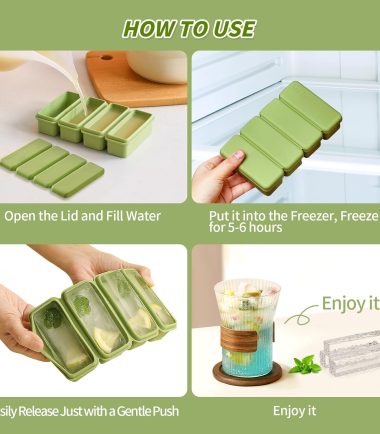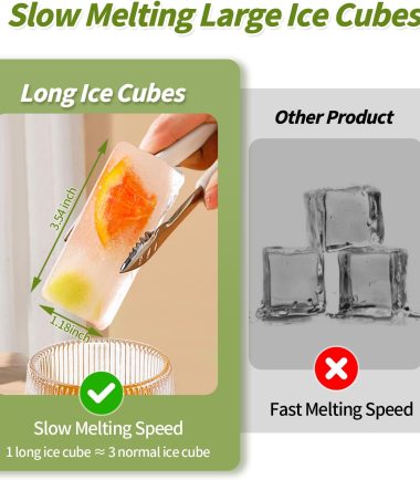 - Long Ice Cube Shape & Stackable: These trays create long ice cubes, ideal for glasses, bottles, or pitchers, enhancing drink presentation and keeping them chilled longer. The silicone trays with lids are stackable, saving space in your freezer