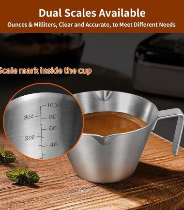 - Dual Scales Design: There are two clear and accurate scales Inner Capacity Markings, ounces and milliliters. The large capacity of 100 ml allows you to fill three servings of espresso at one time. It is a essential espresso machine accessories
