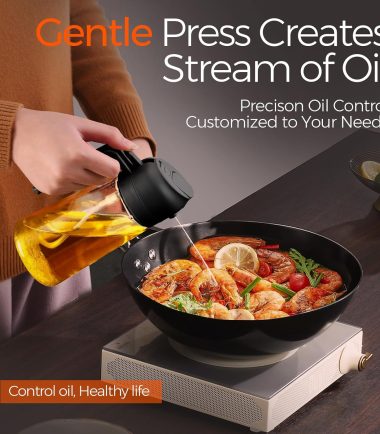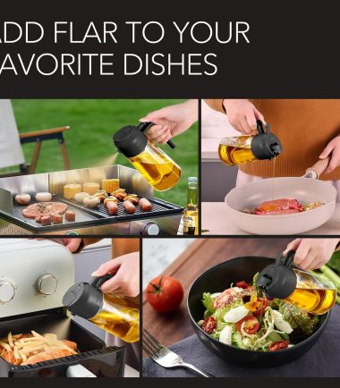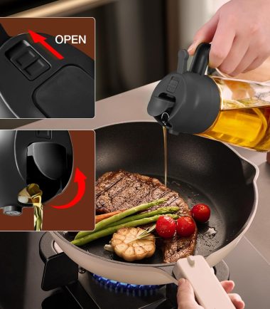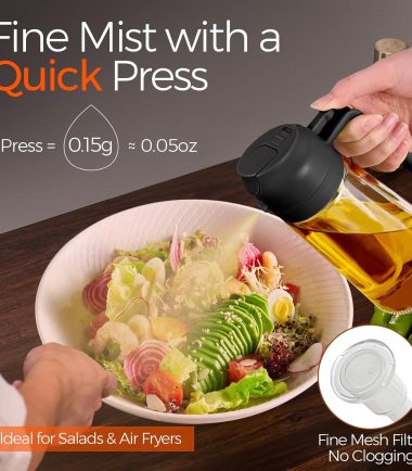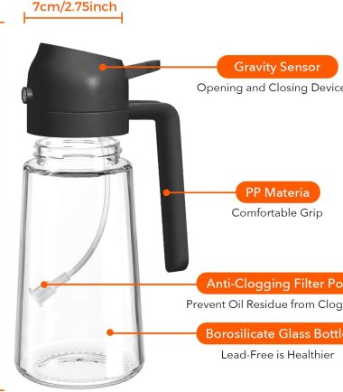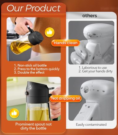 - Not Dirty Hands Design: Olive oil spray bottle is designed with the front-facing, prominent nozzle and the rear comfortable handle design enables users to achieve a fine, uniform, pure mist, users can pour or spray oil without getting their hands dirty
